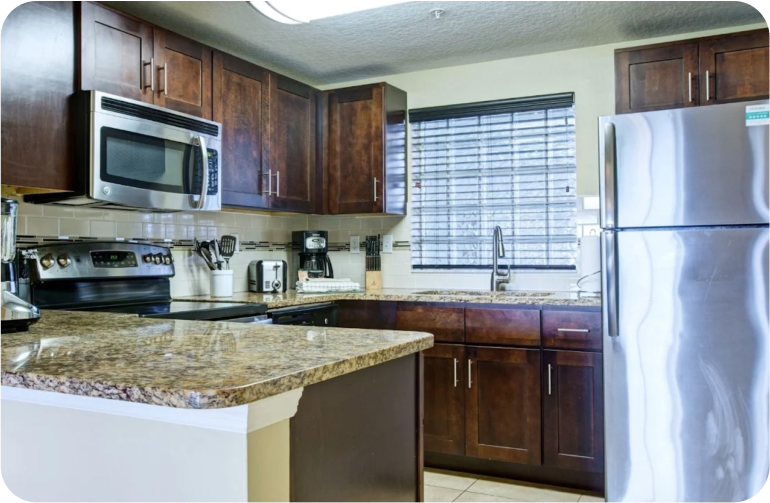 Our 1-bedroom condo at Summer Bay Orlando provides comfort and space for up to four guests. It features a queen bed and sofa sleeper, a full kitchen for home-cooked meals, a dedicated dining area, a cozy living space, a washer and dryer for convenience, and a flat-screen TV for entertainment.